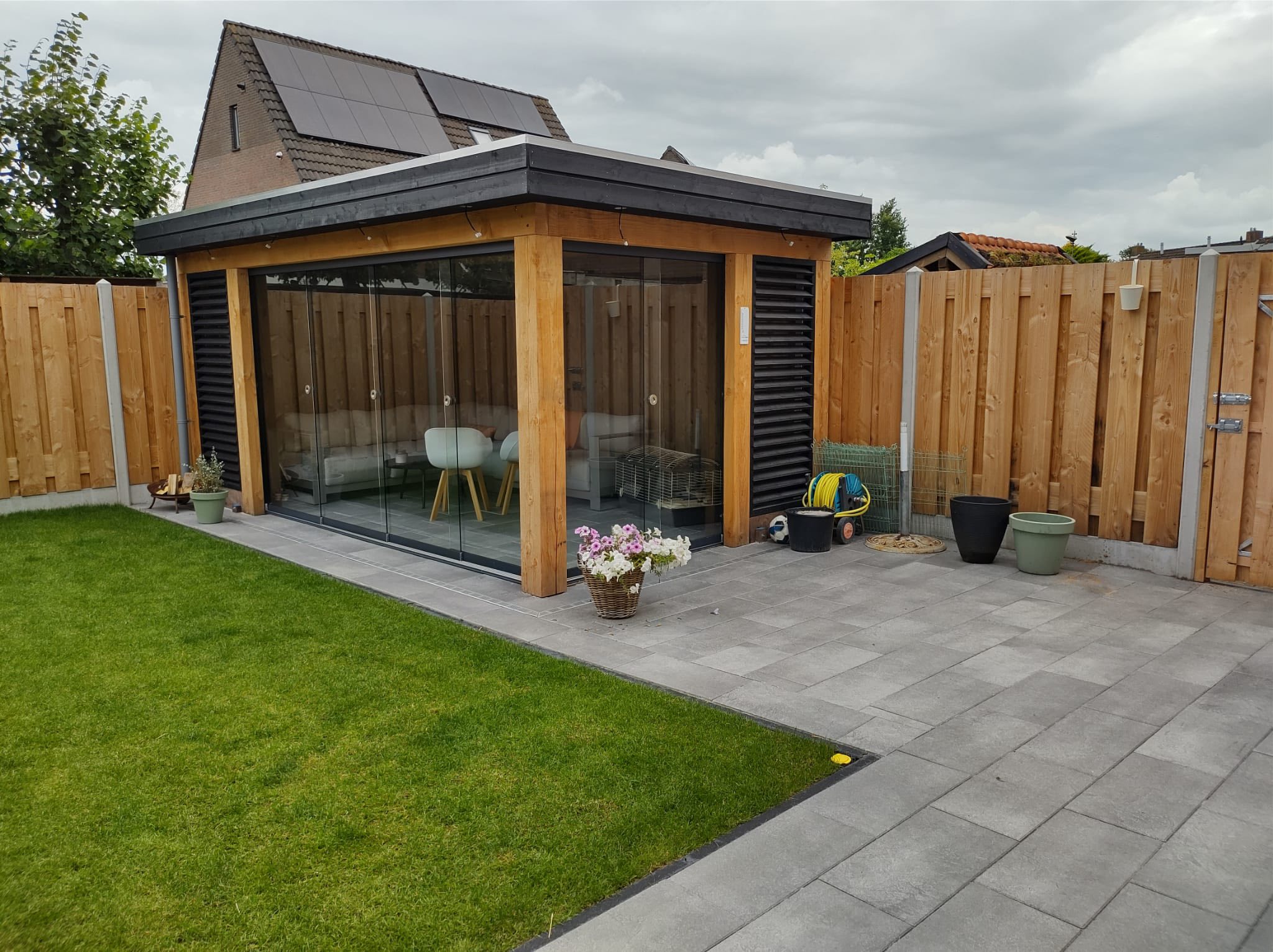 Halfopen overkapping met glazen schuifwanden. Deze halfopen overkapping voorzien van zwart lariks Zweeds rabat en glazen schuifwanden mogen realiseren in Easternijtsjerk.Wij wensen de bewoners veel plezier met hun nieuwe aanwinst!